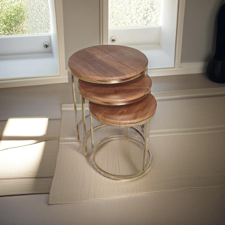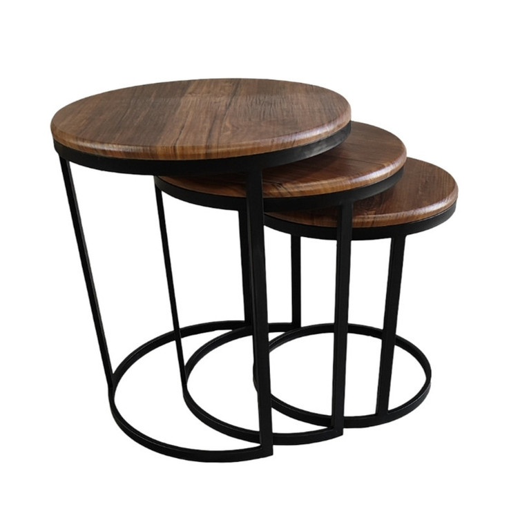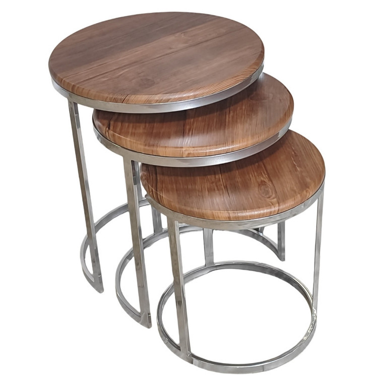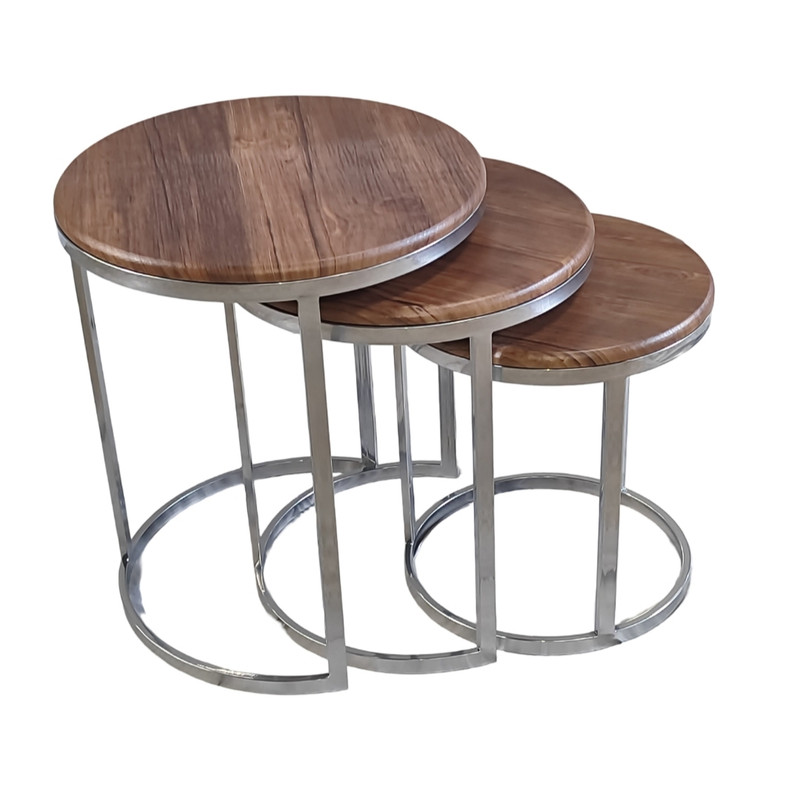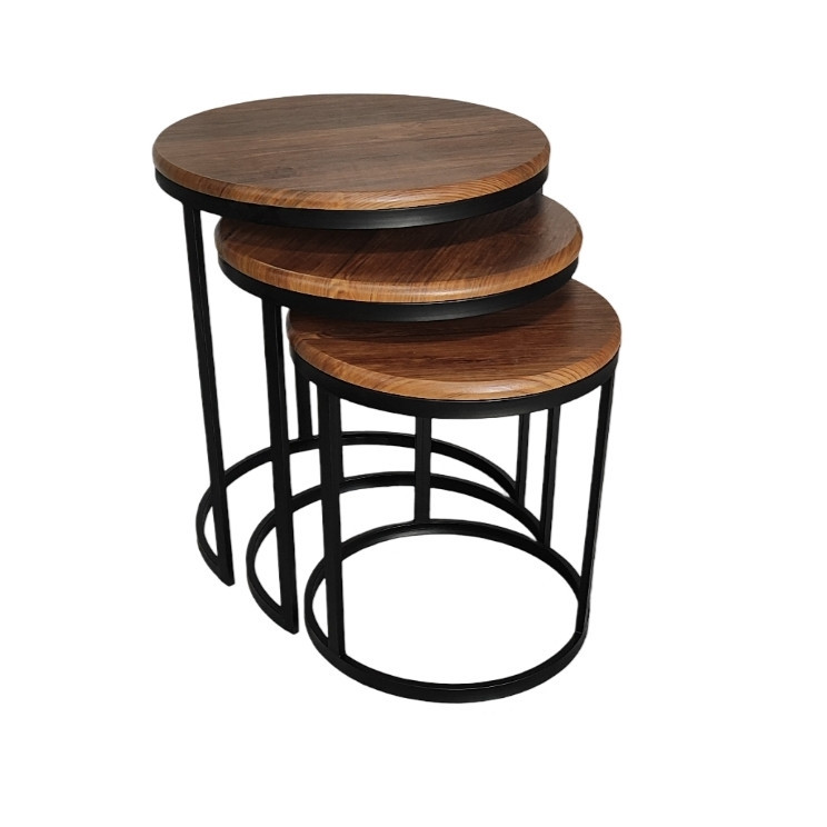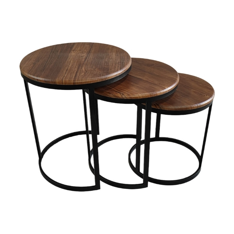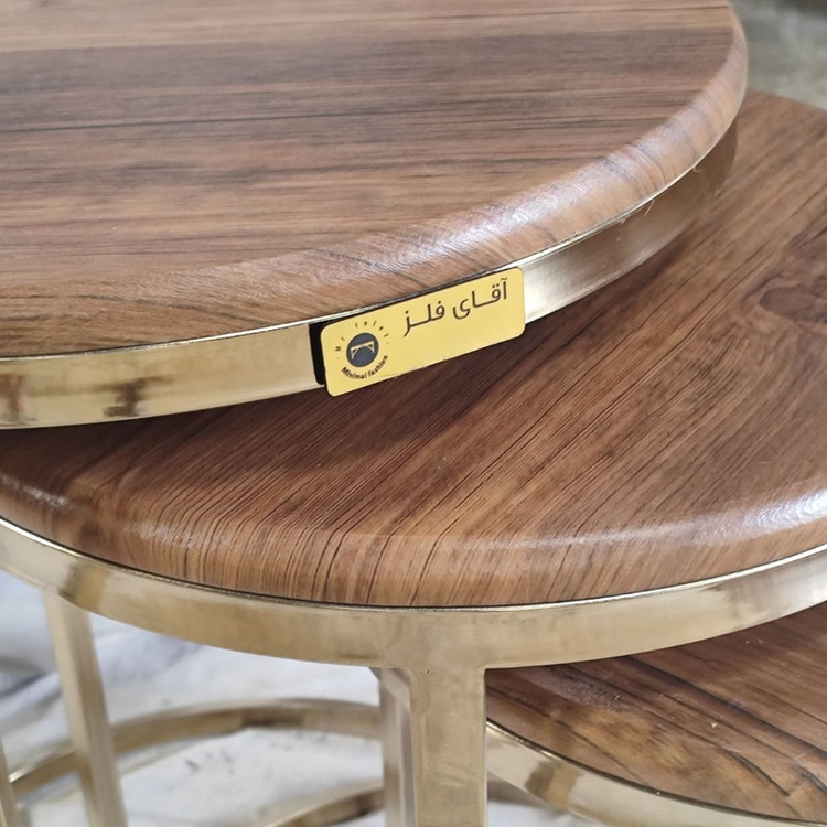 میز جلومبلی سه عددی که به راحتی در زیر یکدیگر قرار میگیرند و فضای کمی اشغال میکنند. پایه از جنس آهن میباشد. رنگ از نوع کوره ای الکترواستاتیک میباشد. در تنوع طلایی براق پایه ها آبکاری شده میباشد. همچنین جنس صفحه ام دی اف با روکش وکیوم میباشد. ابعاد میز کوچک دایره 35 و ارتفاع 38 میباشد. ابعاد میز متوسط دایره 40 و ارتفاع 44 میباشد. ابعاد میز بزرگ دایره 45 و ارتفاع 50 میباشد.